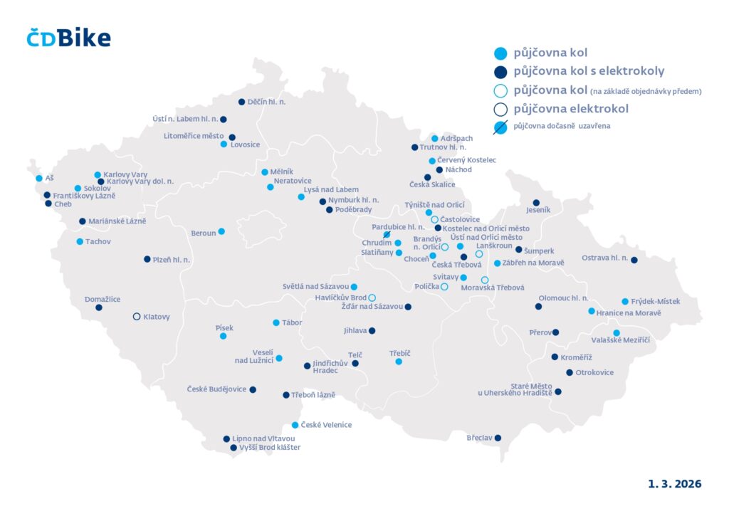 Slnečné a teplé dni lákajú k cyklovýletom. Služba ČD Bike preto predstavuje ideálne riešenie pre tých, ktorí chcú vyraziť na bicykli bez vlastnej výbavy, a to tak v kombinácii s cestou vlakom, ako aj napríklad behom pobytu na dovolenke. Požičovne bicyklov sú umiestnené v turisticky atraktívnych oblastiach i vo väčších mestách. Tento rok fungujú v 67 staniciach, z toho je 59 celoročných a 8 sezónnych. Medzi najvyhľadávanejšie požičovne patrí Břeclav, Karlove Vary dolní nádraží, Třeboň lázně a Poděbrady.