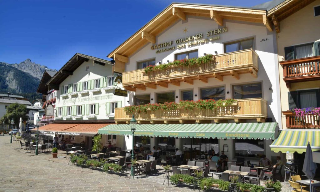 Popis: Pobyt v 4-hviezdičkovom hoteli „Goldener Stern“ sľubuje exkluzívny relax v útulnom, rodinnom prostredí tradičného hotela z roku 1592, ktorý sa nachádza v srdci pešej zóny Abtenau. Tichá a zároveň centrálna poloha, obklopená úchvatnou horskou scenériou, vás určite poteší. Tento vidiecky hotel, zariadený v modernom salzburskom štýle a ponúkajúci 70 lôžok, pozýva hostí na relax a oddych. Všetky izby sú vybavené kúpeľňou so sprchovacím kútom/WC, káblovou TV, telefónom, Wi-Fi pripojením na internet, sušičom vlasov, hotelovým trezorom a väčšina z nich má aj posedenie a balkón. Z hotela uvidíte nádherné hory obklopujúce obec Abtenau, Tennengebirge. K vybaveniu patrí sauna, biotop na kúpanie sa, ako aj veľká lúka s lehátkami, vlastná, domáca cukráreň, vynikajúca kuchyňa. Hostí rozmaznávajú tunajší kuchári regionálnymi i sezónnymi produktami a skvelým jedlom.